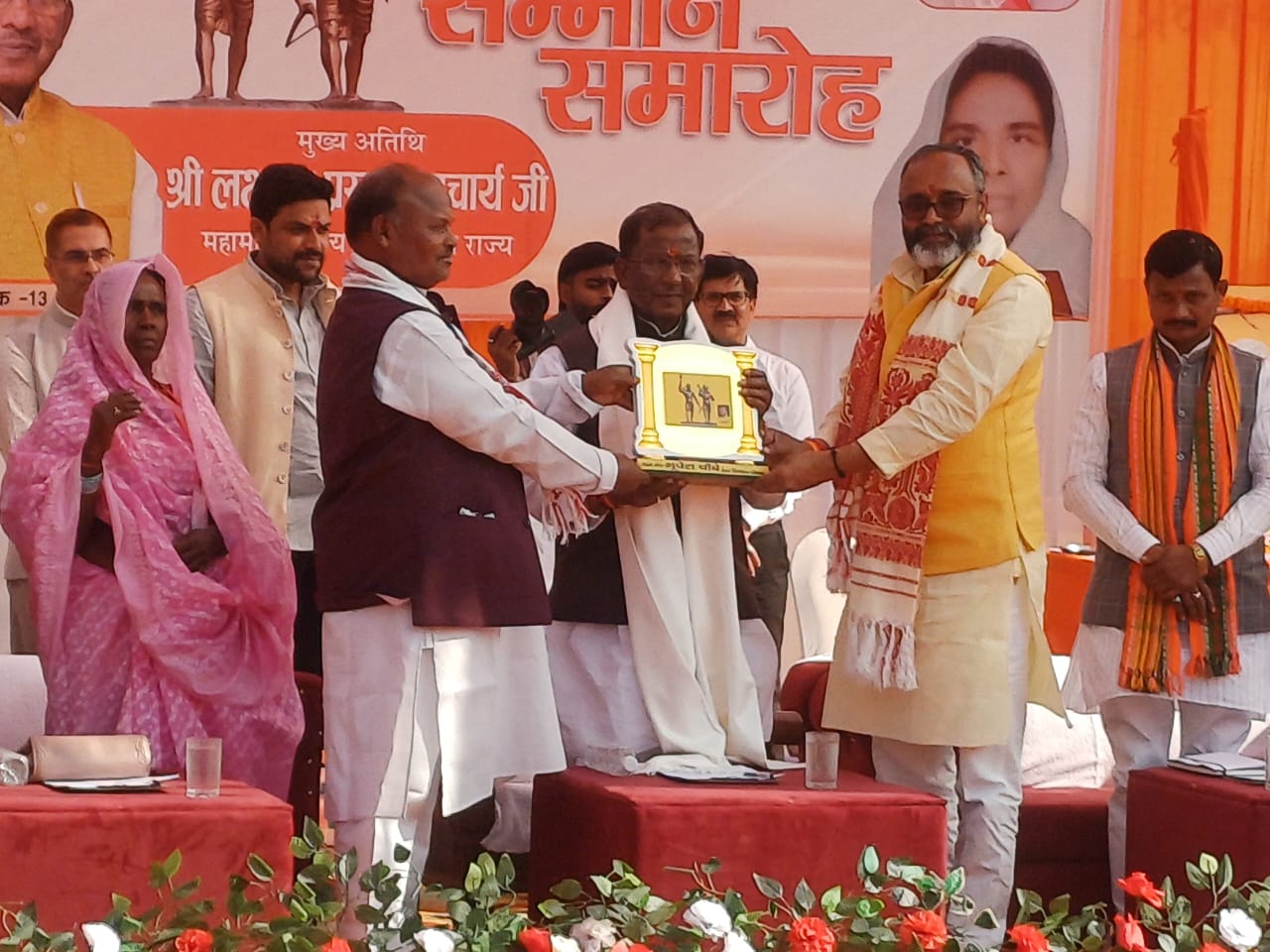 को संबोधित किया समारोह में एक दर्जन से अधिक ऐसे आदिवासी समूह के लोगों को सम्मानित किया गया जिन्होंने अपने क्षेत्र में विशिष्ट कार्य किया है। कार्यक्रम की अध्यक्षता पूर्व विधायक घमडी खरवार की पत्नी कमलावती खरवार ने किया कार्यक्रम का संयोजन मुन्ना धनगर द्वारा किया गया था। कार्यक्रम में जीत सिंह खरवार उपाध्यक्ष अनुसूचित जाति जनजाति आयोग ने अभिनंदन पत्र पढ़ा कार्यक्रम के संरक्षक भारतीय जनता पार्टी काशी क्षेत्र के पूर्व उपाध्यक्ष रमेश मिश्रा जी थे इस मौके पर तमाम लोगों द्वारा राज्यपाल का सम्मान व स्वागत किया गया। इसके पूर्व राज्यपाल द्वारा सिलथम गांव में स्थित आदिवासी स्वतंत्रता संग्राम सेनानियों हरिवंश धांगर वह विशुन धांगर स्मृति द्वार का लोकार्पण किया गया। स्मृति द्वार का निर्माण विधायक निधि से कराया गया है। इसी तरह रामगढ़ बाजार में स्थित कालिदास शिक्षण संस्थान परिसर तक ग्राम पंचायत से बनवाए गए इंटरलॉकिंग संपर्क मार्ग का लोकार्पण भी राज्यपाल द्वारा किया गया। सर्किट हाउस से चलने के बाद जिला मुख्यालयसे लेकर पटना तक जगह-जगह नागरिकों वी विद्यालय के बच्चों द्वारा माल्यार्पण कर व वंदे मातरम के जय घोष के साथ स्वागत किया गया रामगढ़ कस्बा में स्थित अपने छोटे भाई के शीतल आचार्य के आवास पर भी राज्यपाल का आगमन हुआ जहां क्षेत्र के तमाम गणमान्य लोगों ने उनका स्वागत किया इस मौके पर पूर्व के कई पुराने संघ व भारतीय जनता पार्टी के कार्यकर्ताओं ने राज्यपाल को बुके देकर स्वागत किया दोपहर का भोजन राज्यपाल लक्ष्मण आचार्य द्वारा अपने भाई के आवासपर किया गया।सुरक्षा की दृष्टि से जिला मुख्यालय से लेकर पटना तक जगह-जगह पुलिस व खुफिया तंत्र के लोग तैनात रहे सुबह से ही जिलाधिकारी बद्री नाथ सिंह,ज्वाइंट मजिस्ट्रेट उत्कर्ष द्विवेदी पुलिस क्षेत्राधिकार रणधीर मिश्रा समेत कई आला अधिकारी कार्यक्रम स्थल का जायजा लेते रहे।