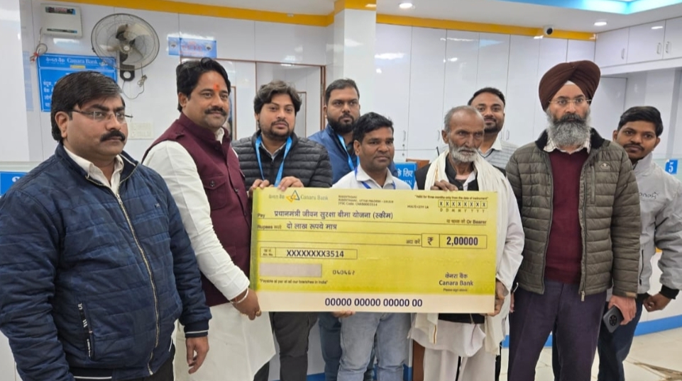 सोनभद्र। केनरा बैंक की नगर शाखा स्थित में मंगलवार को शाखा प्रबंधक और सदर ब्लॉक प्रमुख अजीत रावत के द्वारा प्रधानमंत्री जीवन ज्योति बीमा योजना के तहत मृतक के पिता सीताराम को 2 लाख का चेक सौंपा गया। मृतक रविन्द्र का विगत 30 सितम्बर को सड़क