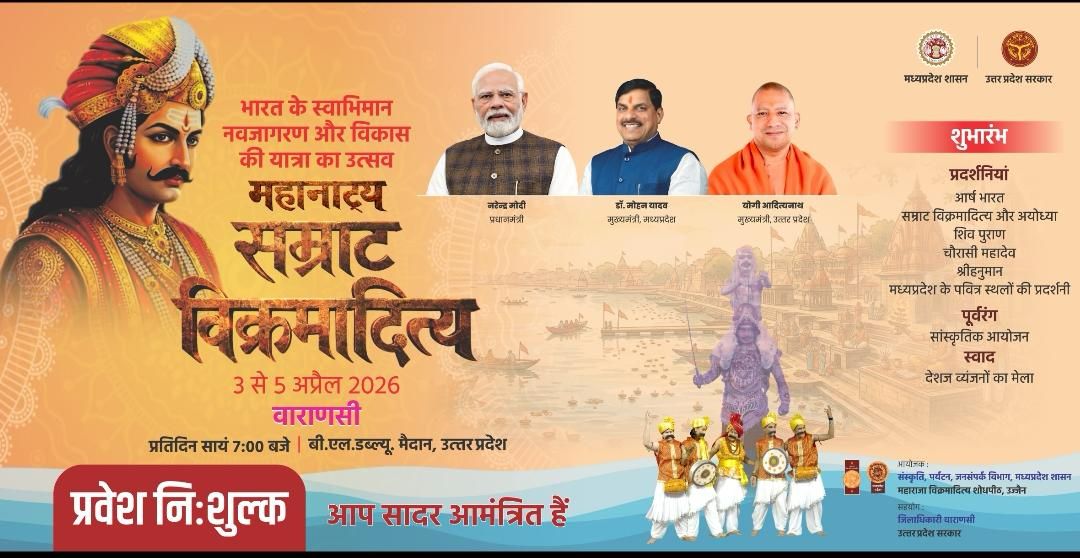 वाराणसी। वाराणसी में महानाट्य ‘सम्राट विक्रमादित्य’ का मंचन, मध्य प्रदेश सरकार द्वारा विक्रमोत्सव-2026 के अंतर्गत 3 से 5 अप्रैल 2026 तक बी.एल.डब्ल्यू. मैदान में प्रस्तुत होने जा रहा है। यह ऐतिहासिक सांस्कृतिक साहित्यिक दृष्टि से एक महत्त्वपूर्ण कीर्ति यज्ञ है। यह केवल एक नाटकीय प्रस्तुति नहीं, अपितु भारतीय इतिहास की गौरवशाली धारा को पुनः सजीव करने का एक सशक्त प्रयास है, जिसमें शौर्य, न्याय, सुशासन और सांस्कृतिक वैभव की अमर गाथा मंच पर उतरती है।