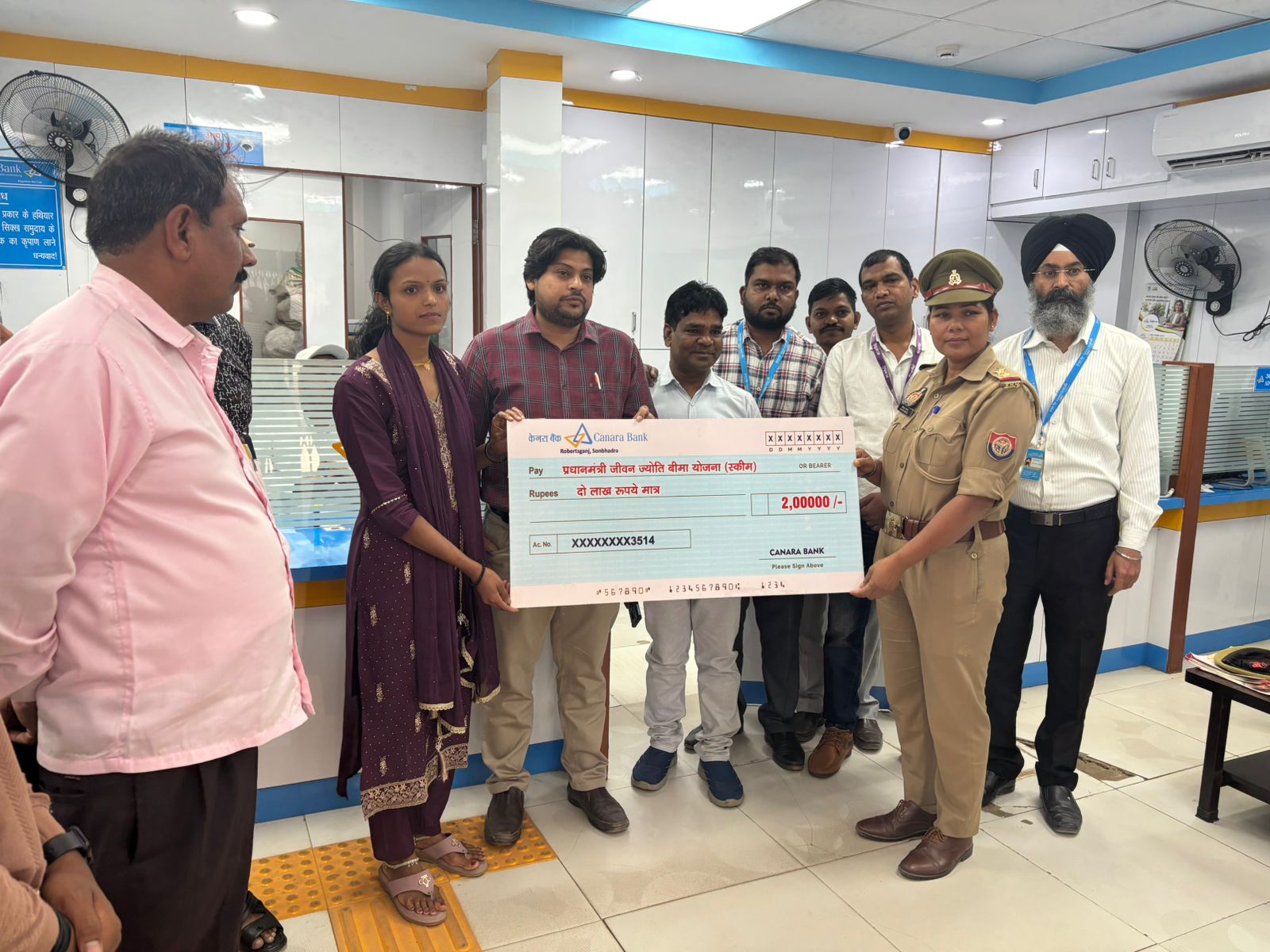 सोनभद्र। राबर्ट्सगंज नगर स्थित केनरा बैंक ने शुक्रवार को मृतक आश्रित परिवार के सदस्यों को प्रधानमंत्री जीवन ज्योति बीमा योजना के तहत महिला थाना प्रभारी सविता सरोज व शाखा प्रबन्धक आरिफ अब्बास के द्वारा मृतक आश्रित के परिवार को दो लाख का चेक दिया गया। महिला थाना प्रभारी सविता सरोज ने कहा कि किसी की मृत्यु की भरपाई पैसे से नही की जा