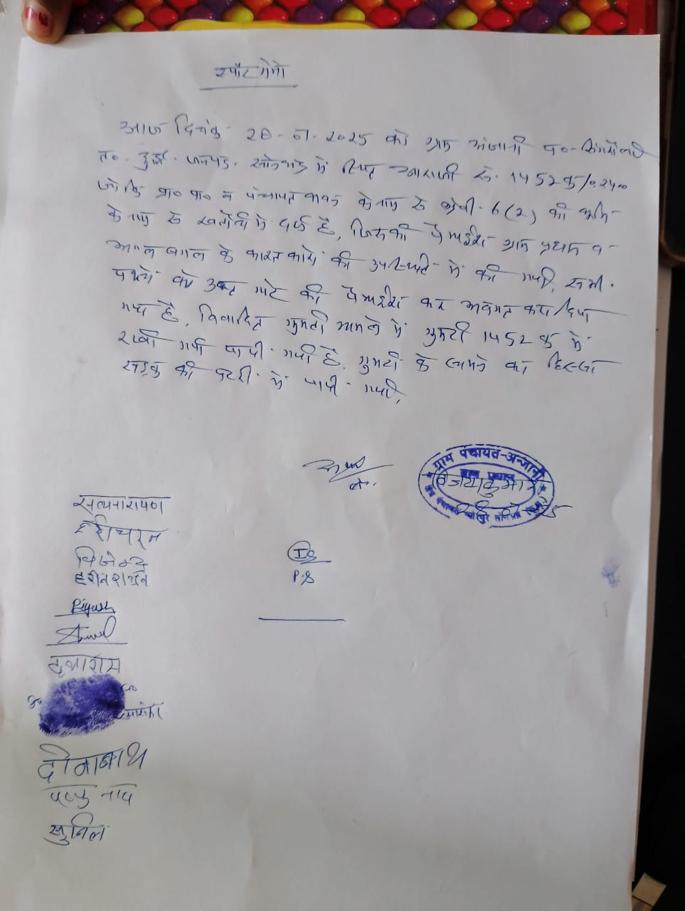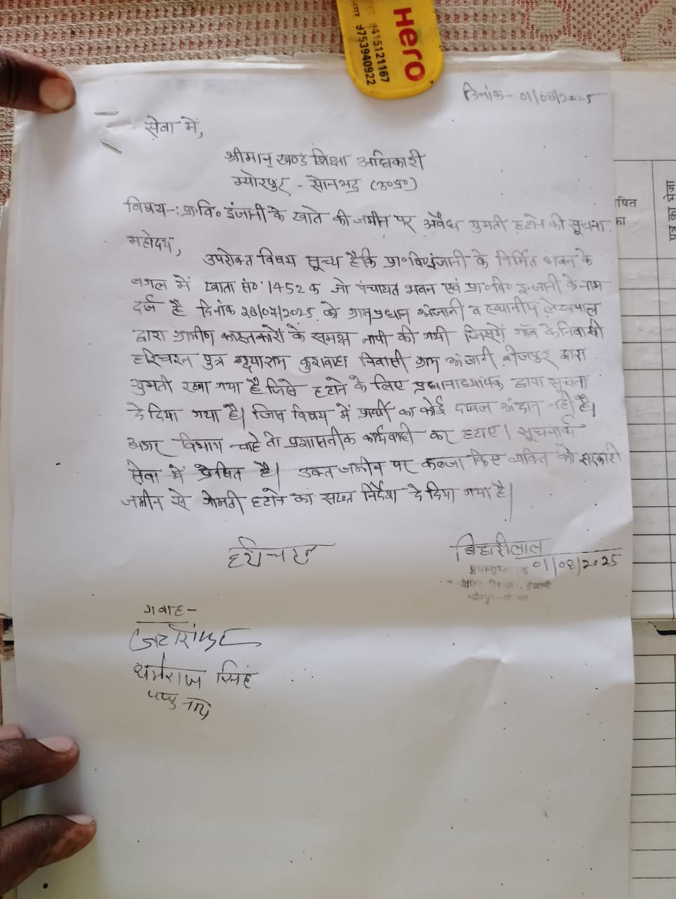 उपस्थिति में ग्रामीणों के सामने जमीन की पैमाइश की गई थी।पैमाइश में यह स्पष्ट हुआ कि गांव के ही निवासी ने विद्यालय की इस जमीन पर अवैध रूप से अपनी गुमटी रख ली है।विद्यालय के प्रधानाध्यापक द्वारा संबंधित व्यक्ति को पूर्व में भी गुमटी हटाने के लिए सूचित किया गया था लेकिन स्थिति जस की तस बनी हुई है।पत्र में स्पष्ट किया गया है कि विद्यालय प्रशासन का इस अतिक्रमण में कोई हस्तक्षेप नहीं है और विभाग से अनुरोध किया गया है कि इस पर प्रशासनिक कार्रवाई करते हुए अवैध कब्जे को हटवाया जाए।पत्र पर प्रधानाध्यापक बिहारी लाल और गवाहों के रूप में जटाशंकर, धर्मराज सिंह और पप्पू नाथ के हस्ताक्षर मौजूद हैं।
